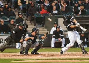 May: An unidentified White Sox player is fouling off a pitch (the ball is above and behind him as he swings); not hitting a home run or even getting a single.  A foul ball; strike two!  In the background are Sox fans huddled in parkas and ski hats, looking generally displeased.  (It has occurred to me that you could take a picture at a Sox game on the most beautiful day imagined and it could be appropriately captioned “Sox fans looking generally displeased.”)  Not only is the photo of something not-so-great happening, there are a grand total of zero happy people in the picture.
