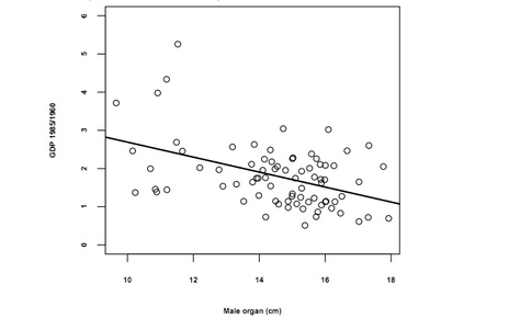 That’s right, penis size. In a study published [July 18], the University of Helsinki’s Tatu Westling points out a surprising strong correlation between a country’s GDP growth rate and average penile length. As the chart above shows, countries that averaged smaller penis sizes grew at a faster rate than their larger counterparts between 1960 and 1985. Every centimeter increase in penis size accounted for a 5 to 7 percent reduction in economic growth. The study also showed that overall GDP was at its highest in countries with average-sized penises with GDP falling at the extremes of penis length.